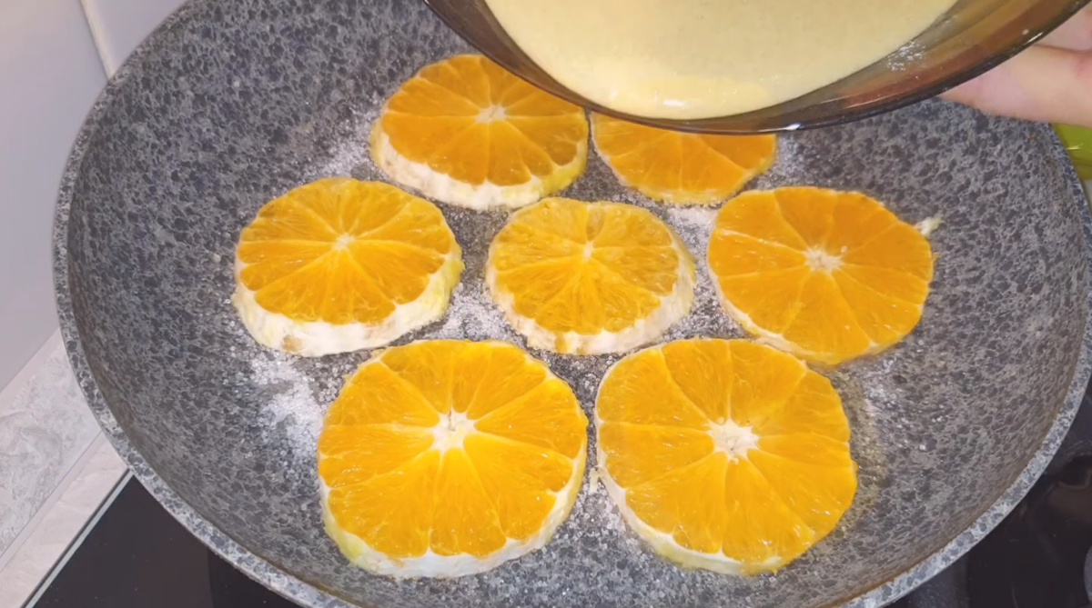 Заливаю апельсины жидким тестом на молоке и готовлю пирог на сковороде (рецепт апельсинового пирога)