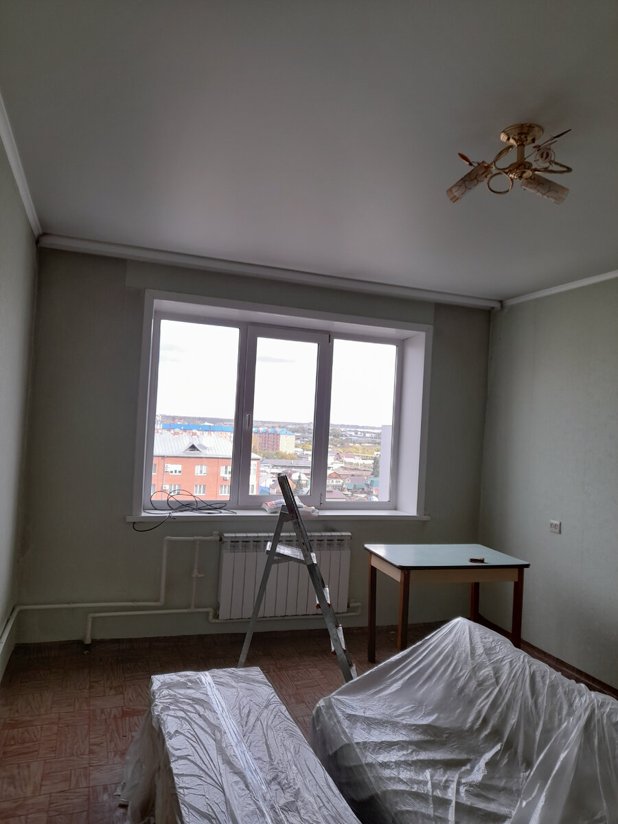 Данная комната (гостиная) находится в 2-х комн. квартире панельного 9-ти этажного дома 1991 года постройки. Нас пригласила молодая женщина, ей нужно было сделать полный ремонт в гостиной. Последний косметический ремонт здесь был более 10 лет назад. После того, как обсудили все нюансы по работе, материалам и ценам, мы отправились в магазин, где сделали заказ и доставку на весь необходимый материал. Так как натяжной потолок был уже установлен, то нам требовалось выровнять стены, наклеить обои, сделать наливной пол и постелить линолеум. Так выглядела комната, когда мы пришли в первый день. Обои уже достаточно загрязнились, в углах все потрескалось. Демонтировали не только старые обои, но и слой шпаклевки, который частично отходил вместе с обоями. Вот так выглядела комната после полного демонтажа старого покрытия и грунтовки, углы разбили, затем запенили монтажной пеной. Стены в комнате визуально ровные, поэтому мы нанесли один слой штукатурки, единственное стену у окна и углы выравнивали
