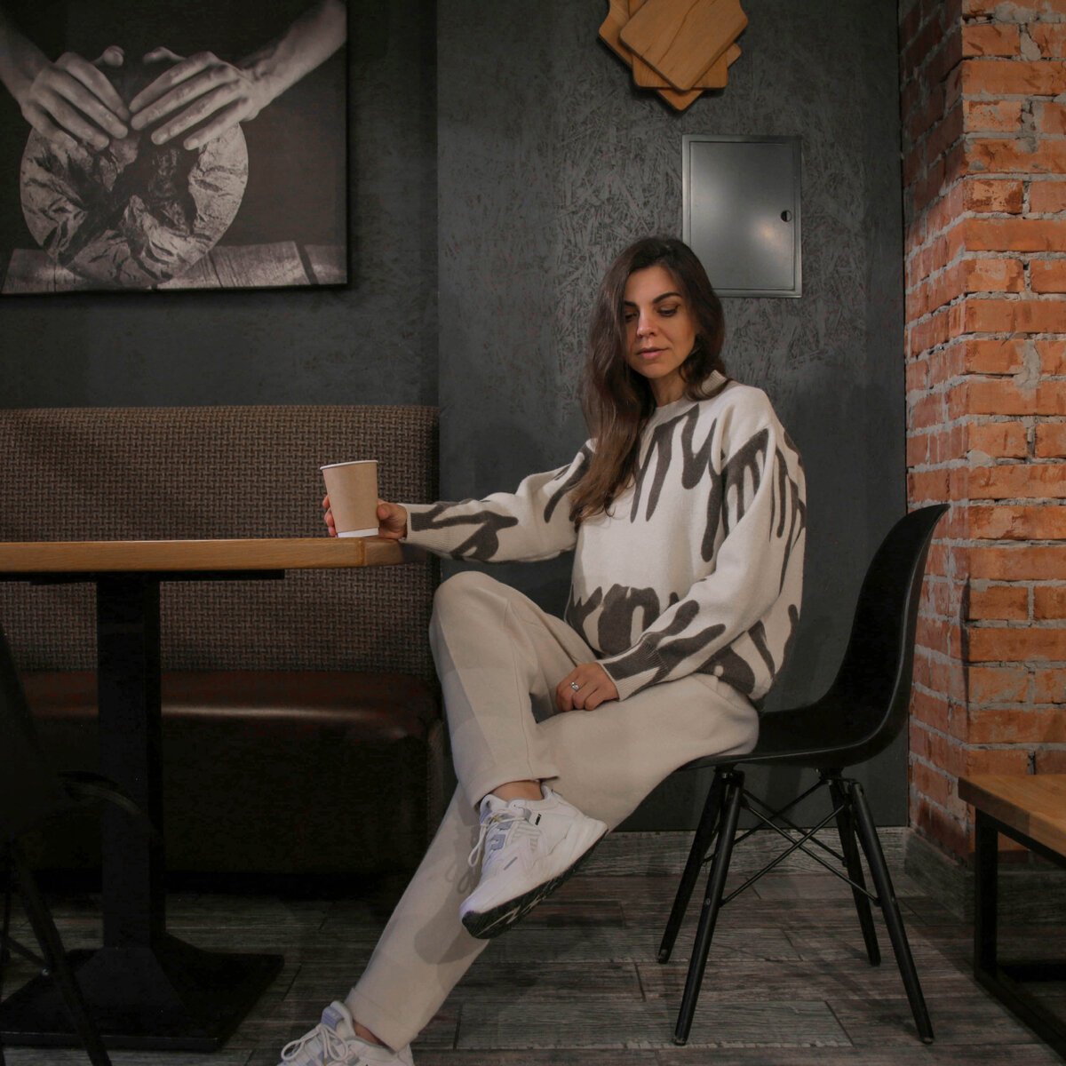 Привет всем 💗 До распродажи на AliExpress осталось всего два дня. Мой виш-лист переполнен, но пока до конца не определилась, что буду покупать. Обычно решаюсь в последние часы распродажи 😀 А вот вам идея покупки - тёплый стильный костюм, который идеально подойдёт на холода. Мне в костюме было очень жарко фотографироваться в кафе. Он из толстой пряжи. Вязка машинная, плотная, гладкая. В составе кашемир, хлопок и спандекс. На поверхности есть ворсинки (или как правильно назвать? пушинки? шерстинки? 😀) Ткань толстенькая. К телу материал комфортный, довольно мягкий, не скрипучий и не колючий. Почти не мнётся. Дизайн классный! Свитер с круглым вырезом и заниженной линией плеча. Длина рукава отличная. Пояс брюк на резинке с завязками. Впереди стрелки. По бокам карманы. Внизу отвороты. При моём росте 162 см длина брюк ниже щиколотки. Девушкам повыше костюм подойдёт. Костюм представлен в 8-ми интересных расцветках. Я выбрала вариант Apricot Khaqi G606. Фото продавца оттенок плюс-минус со