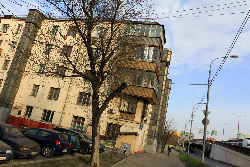 2. Этот пяти-шестиэтажный десятиподъездный кирпичный жилой дом, относящийся к архитектурному ансамблю жилмассива «Русаковский», экспериментальный проект строительства жилого дома с плоской крышей Ле Корбюзье, положивший начало применения имитаций плоских крыш-террас с помощью ограждений в архитектуре СССР. Архитектором конкретного этого здания стал Анатолий Жуков (в соавторстве с М. Мотылевым).