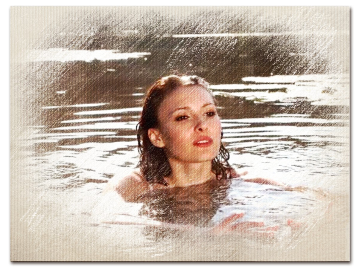 Девушка медленно выходит из воды, закручивая волосы на затылке. Вышла. Одежды нет. Растерялась, оглядывается. Слышит мужской гогот из кустов. Показались две насмехающиеся физиономии. Девушка моментально прыгнула в речку. Перепугана. Она знает всех в деревне, на такое хулиганство никто не способен. Поняла, что они из коттеджного посёлка.