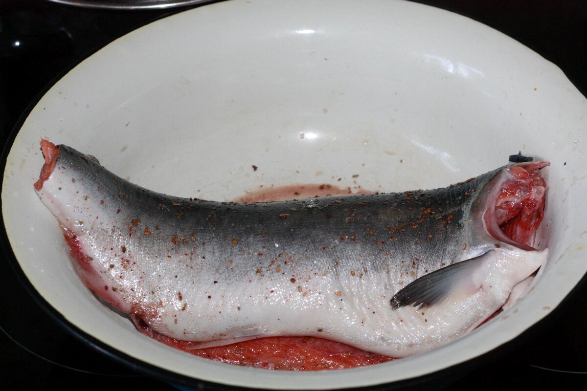 Размораживаем горбушу, чистим. Отрезаем голову и хвост, солим, перчим, добавляем специи, которые Вам нравятся к рыбе. Оставим на полчаса подмариноваться.