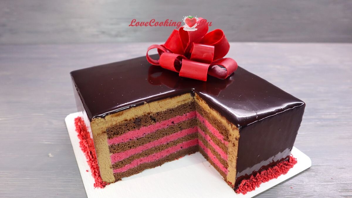 Шоколадный муссовый торт "Подарок" отлично подойдёт к праздничному чаепитию. Торт состоит из влажного шоколадного бисквита, смородинового и шоколадного мусса, залит зеркальной шоколадной глазурью и декорирован шоколадным бантом.