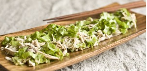 Это было первое блюдо, которое мы приготовили с моей подругой в Германии из новоприобретенной книги Штеффана Хенсслера «Schnell, schneller Henssler!». Вся задумка книги заключается в категориях: блюда за 10 минут, за 15 минут, за 20 и 25 минут. При минимальных временных затратах, получается изумительный завтрак, обед, ужин, легкий перекус, десерт или даже угощение для пикника. Мы сразу из книжного магазина пошли в продуктовый и купили все ингредиенты для этого салата. Делали, не отступая ни на шаг — и это было прекрасно. Идеально сбалансированный вкус и сочетание. В восторге остались все, от мала до велика. Дома, практически, первым делом повторила этот салат, но с некоторыми видоизменениями. Если в Берлине можно в любом близстоящем магазине купить все и сразу, то в Петербурге — за стеклянной лапшой ехать на один конец города, за кунжутным маслом на другой. Мне пришлось заменить эту лапшу на рисовую, а римский салат на обычный. Увы, салат от этого не выиграл, а даже несколько проиграл.