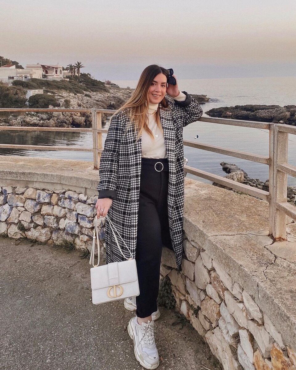 ✔️ На однотонном фоне вы очерчиваете нижнюю и верхнюю границы. Черные брюки высокой посадки + черные ботинки. У брюк коричневый ремень, у ботинок коричневая подошва, кажется, что все это длина ноги, хотя и вниз, и верх мы строили длину.