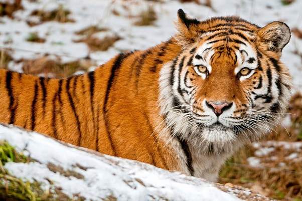 Амурский тигр – самая крупная хищная кошка на земле. В народе животное называют уссурийским или дальневосточным, но официальное название всё же — амурский тигр. В среднем длина тела редкого зверя достигает до 3 метров, из которых метр с лишним занимает хвост. Вес взрослого животного может достигать 300 килограммов. Но нужно учитывать, что самцы на четверть крупнее самки. Высота в холке – около 1 метра. Места обитания В настоящее время 95% всей популяции амурского тигра обитает в южной части Дальнего Востока России. 5% – в Китае. Спасает от таёжных морозов хищную кошку густая длинная шерсть, а чёрные полосы на ней служат тигру маскировкой. Цвет шубы зимой и летом остаётся одинаково рыжим, разве что к зиме она может немного посветлеть. Пробираться по глубокому снегу и охотиться за животными хищнику помогают широкие лапы. Питание Амурский тигр в день должен съедать 10кг мяса. Основу его рациона составляют олени и кабаны. Но хищник также ловит и поедает других млекопитающих – волка, рысь,
