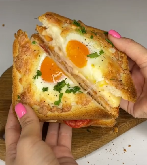 Для начала нужно заранее подготовить духовку, прогреть Ингредиенты: 1. Ветчина 2. Сыр 3. Яйцо 4. Хлеб тостовый 5. Кетчуп 6. Соус сметанный 7. Помидор Шаг 1: Берем хлеб, намазываем соусом всю поверхность с одной стороны Шаг 2: Положить на хлеб ветчину, после чего положить нарезанный помидор и ломтик сыра Шаг 3: Сверху кладем еще один ломтик хлеба, продавливаем в нем ямку и вливаем в нее яйцо После чего посыпаем сыром сверху Шаг 4: После всего выше проделанного, отправляем наш почти готовый завтрак, в духовку на 10-15 минут, всем приятного аппетита.
