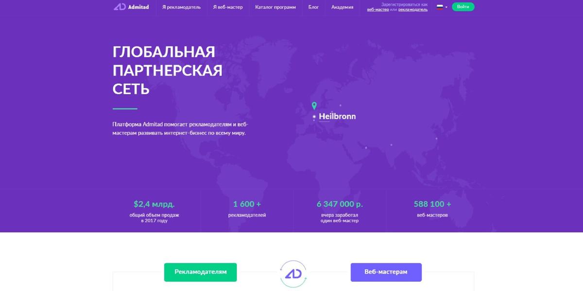 Admitad – это партнерская сеть, которая связывает воедино веб-мастеров и рекламодателей для получения взаимовыгодного результата. Статистика Admitad. Статистика и показатели компании не оставят равнодушными даже убежденных скептиков: Особенности Admitad.com К основным особенностям Admitad.com (официальное имя домена) следует отнести: Не лишним будет обратить внимание на рекламодателей, сотрудничающих с Admitad: а также, веб-мастеров: История создания Admitad.com. 2009 год считается годом создания концепции партнерской сети Admitad. Основатель компании и ее СЕО — Александр Бахманн. Первые офисы компании появились в г. Хайльбронн, Германия и г. Минск, Республика Беларусь. Штат компании составлял 5 человек. В настоящий момент штат компании составляет более 500 человек. Офисы находятся в 7 станах мира, таких как: Германия, Украина, Республика Беларусь, Индия, Россия, Китай, ОАЭ. Способы заработка на Admitad. Перечислим все виды заработка: Заработок заключается в отправке ссылок друзья