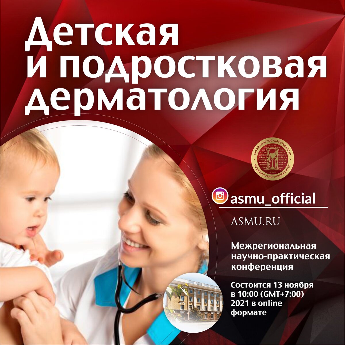 13 ноября в 10:00 (GMT+7:00) 2021 состоится «Межрегиональная научно-практическая конференция "Детская и подростковая дерматология» в online формате. Модератор конференции - Ковалёва Юлия Сергеевна, д.м.н., главный внештатный специалист дерматовенеролог и косметолог Минздрава Алтайского края, заведующая кафедрой дерматовенерологии, косметологии и иммунологии ФГБОУ ВО АГМУ Минздрава России. Организаторы: Министерство здравоохранения Алтайского края, Алтайский государственный медицинский университет и Алтайское отделение российского общества дерматовенерологов и косметологов. Конференция аккредитована в Координационном совете по развитию непрерывного медицинского и фармацевтического образования МЗ РФ по специальностям: дерматовенергология, аллергология и педиатрия . Программа конференции. Лекторский состав. Тематика конференции: * Особенности течения хронических дерматозов в детском и подростковом возрасте * Инфекционные и вирусные болезни детей * NB! — детская