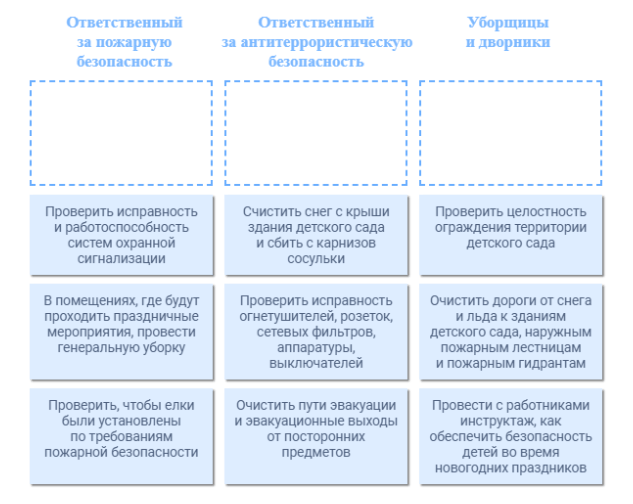 Предлагаем тренажер, с помощью которого вы быстро распределите поручения работникам, чтобы подготовить детский сад к новогодним утренникам, проверить пожарную безопасность и антитеррористическую защищенность, а также усилить меры профилактики инфекционных болезней. Перетащите карточки с поручениями на тех работников, которые, по вашему мнению, должны это выполнять. Когда соответствия установите, нажмите кнопку «Проверить». Попробовать на сайте