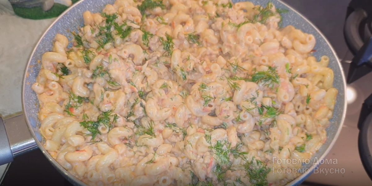 Готовлю макароны с фаршем и со сливками в сковороде.