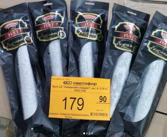 И вот, за месяц с лишним до Нового года, в "Светофоре" начали появляться новогодние новинки. Одну из них я сразу заметила в холодном отделе, это свиной фуэт. Колбаска, которая покрыта благородным белым слоем плесени, изготовлена у нас по рецептуре из Испании. Но всё по порядку. Предлагаю вашему вниманию обзор товаров из "Светофора" в городе Новороссийск. Длинная тонкая свиная, сыровяленая колбаска "Фуэт" с белым покрытием, массой 250 грамм. Цена 180 рублей. Относится к деликатесам, кстати с испанского переводится, как кнут. Сыровяленые колбаски "Сигарки к пиву", в упаковке 230 грамм. Цена 140 рублей. Сервелат "Ореховый", в вакуумной упаковке массой 600 грамм. Цена 320 рублей. Колбаса варёная "Докторская" в вакуумной упаковке. Цена 272 рубля за 1 кг. Лимоны из Турции среднего размера. Цена 71 рубль за 1 кг. В стеклянной банке икра особая лососевая имитированная Царская", массой 220 грамм. Цена 57 рублей. Куриные наггетсы, в упаковке 1 кг. Цена 114 рублей. Мороженая скумбрия вот уже неде