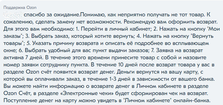 Хотела сегодня написать хорошую статью, но Ozon полностью дестабилизировал душевное состояние. Меня родственники попросили заказать товар. Курьер привез не то, что нужно. Казалось бы, в чем проблема? Я сразу пишу в поддержку, что на завтрашний вечер у нас как раз оформлена другая доставка. Пусть курьер заберет ошибочно доставленный товар и привезет нужный (цена одинаковая). Никаких проблем. Но мы простых путей не ищем! Угадайте, что ответила поддержка Ozon? Это как понимать?! Я честно написала, что, мягко говоря, нахожусь под впечатлением от "восхитительного сервиса". Почему из-за ошибки магазина я должна тратить время, заниматься оформлением возврата, потом с больной спиной (уже несколько дней принимаю анальгетики, поскольку начался рецидив) тащить шестикиллограммовую упаковку в пункт выдачи и 10 дней ждать денег??! Еще два попутных замечания. 1. Нужный товар (который нам не привезли) я так и не получу. Его придется заказывать заново. Когда вернут деньги и если появится желание. А маг