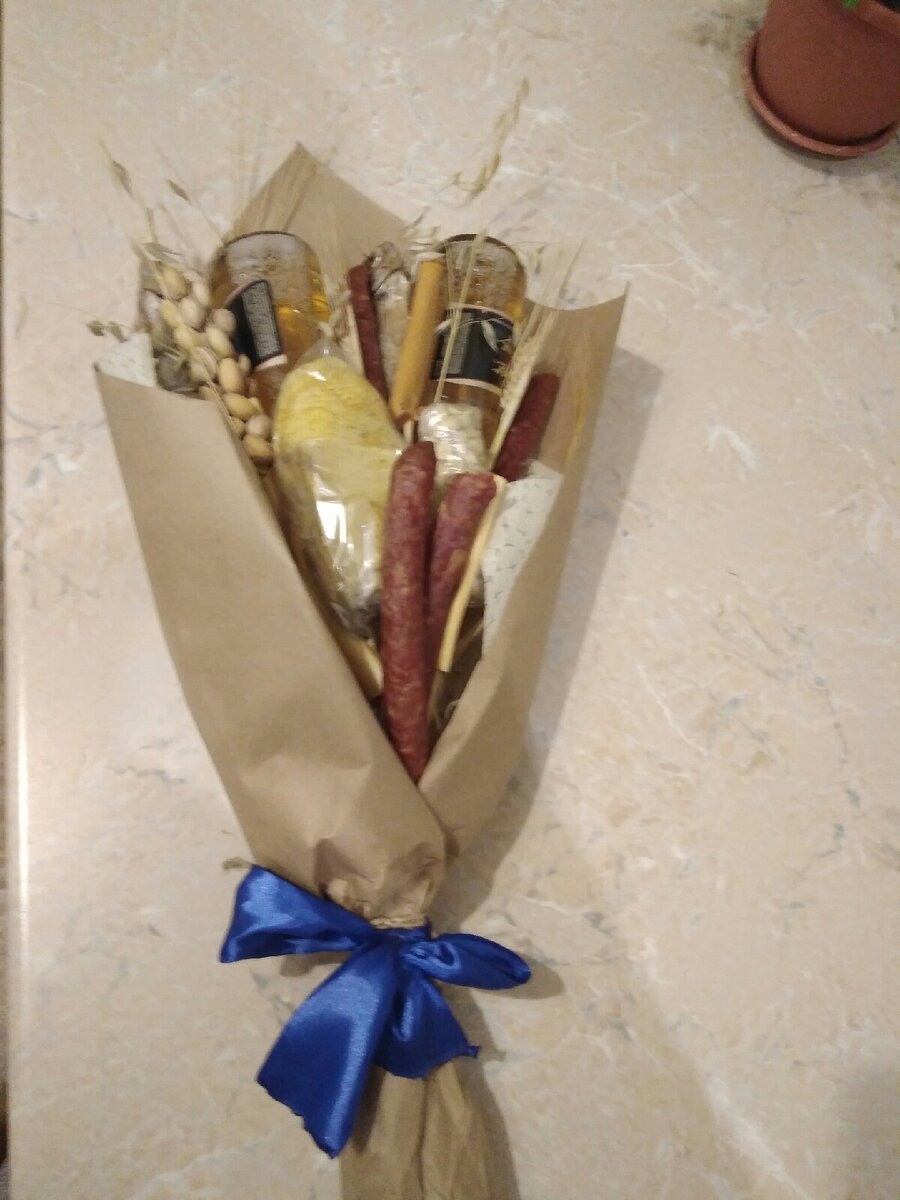 Привет, друзья! Вы наверное все знаете, что прошёл праздник "день мужчин" и был он 6 ноября. Решила я молодому ухажеру своему сделать сюрприз. Несмотря на все его изъяны, все мы не милые и пушистые бываем. А любимых радовать нужно, чтобы они всегда хотели вернуться домой. И вот помимо вкусного ужина я решила собрать ему букет "съедобные" , сама своими руками. Не сразу у меня это все получилось, так как я этого никогда не делала. Но думаю, чем черт не шуткует. Для букета мне понадобилось: Хорошо, что у меня фисташки, сыр и чипсы оставались с прошлой нашей попойки с подругой. Их и использовала, не пропадать же добру. Упаковочная бумага у меня тоже осталась, мне в ней дарили цветы, я её сохранила. В остальном пришло потратиться. Если долго мучиться что - нибудь получится, и вот после долгих усилий я все таки это сделала. И пусть только Васькк не понравится больше ничего ему дарить не буду! Думаю что неплохой букет у меня получился. Зацените.))) Итак, букет готов. Теперь расскажу