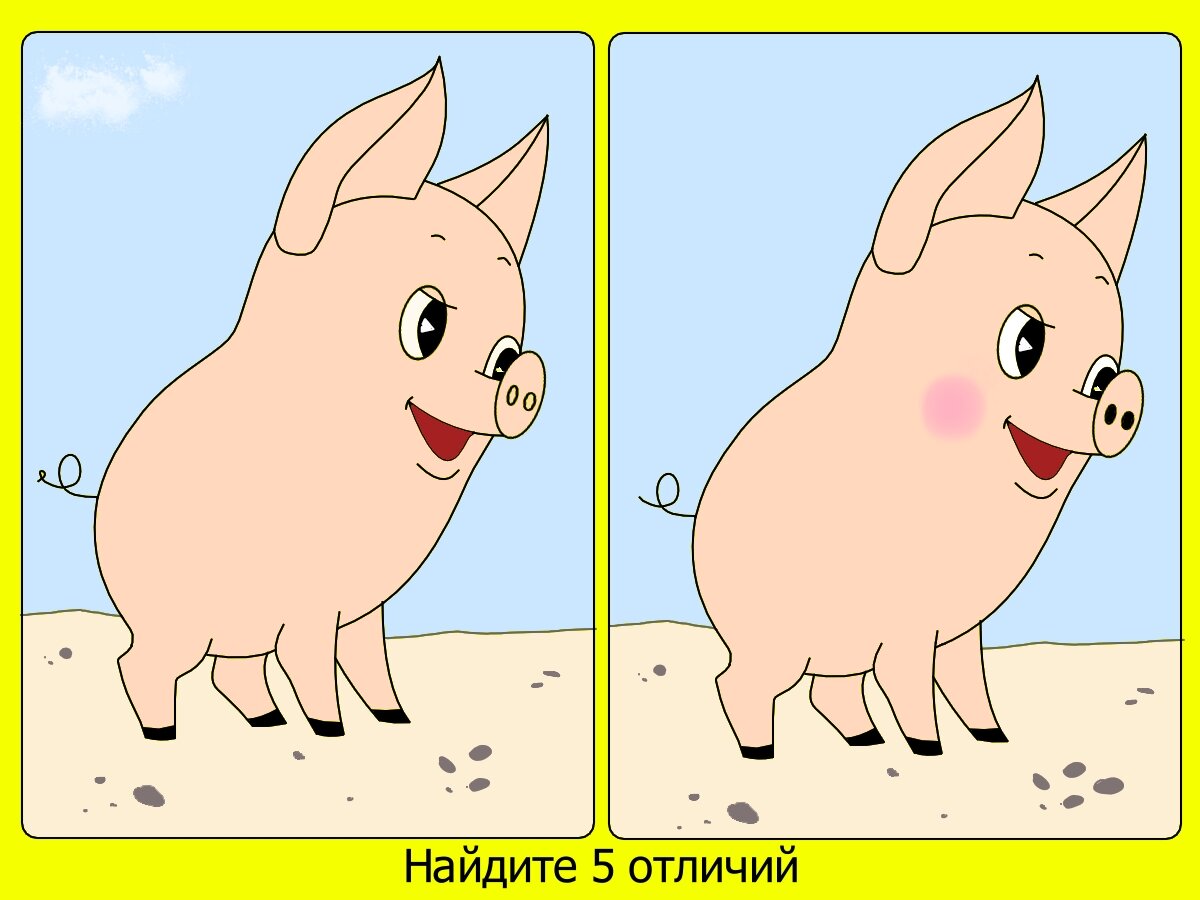 Головоломки «поиск отличий» - одни из самых любимых и популярных загадок во всем мире. Их с удовольствием разгадывают и взрослые, и дети, развивая и тренируя при этом внимательность. Сегодняшнее задание очень простое. Нужно найти всего лишь 5 отличий на картинках с забавными свинками. Ну, а те, кому такие легкие загадки не по нраву, могут усложнить себе задачу – ограничить время поиска. Например, до 30 секунд. Или устроить соревнование «кто быстрее?» Время пошло) Пишите свои рекорды в комментариях)