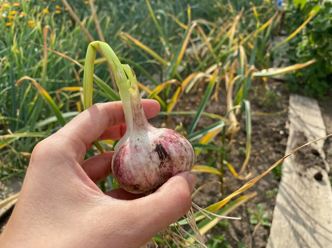хотел бы вам показать какой чеснок уже необходимо начинать выкапывать конечно стоит обратить внимание для начала на сам стебель как видите чеснок уже именно вот этот то его уже давно надо выкопать потому что он полностью сухой если посмотреть на этот чеснок стебель то как видите он еще не готов а вот это уже самый идеальный вариант когда уже можно начинать в и тобой чеснок и так даже его начинать вообще как правило все копают чеснок на петропавл а то есть это если не ошибаюсь 12 июля то есть ну понятно что как бы если я оставлю чеснок на петропавл а то с этого чеснока я потом не смогу собрать ее у данного чеснока уже не будет товарный товарного вида поэтому надо копать чеснок когда у него нижние листья начинают подсыхать в таком состоянии даже если я начну копать вот такой вот чеснок ничего страшного мы получим чеснок с хорошим товарным видом выкапывать я буду с помощью простой лопаты ну что ж друзья вот я и выкопал весь чеснок как видите это столько чеснока получилось с одного ведра з