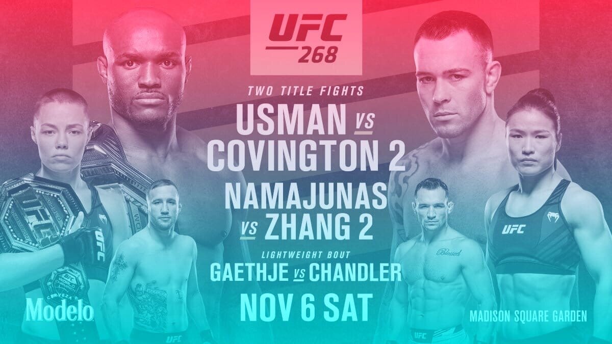 Камару Усман - Колби Ковингтон Главный поединок вечера Камару Усман - Колби Ковингтон в полусреднем весе, закончился победой Усмана (судейским решением). Нигериец сумел успешно защитить свой титул. Основная статистика поединка Из ярких моментов поединка следует отметить концовку второго раунда. В ней Ковингтон пропустил сокрушительный встречный хук, после чего отправился в нокдаун, но благодаря греплингу он смог дожить до гонга. Джастин Гейджи - Майкл Чендлер Первый раунд отметился зрелищной зарубой. В ходе поединка лидировал Гейджи, во втором раунде ему удалось провести прекрасный апперкот после чего Чендлер упал, но смог выжить благодаря борцовской технике. Бой закончился победой Гейджи (судейским решением). Роуз Намаюнас - Вейли Жанг Второй титульный поединок проходил в женском наилегчайшем дивизионе. И как в первом - закончился защитой титула. Поединок носил довольно равный характер, но в завершающих раундах Роуз продемонстрировала более убедительную работу за что и получила судей