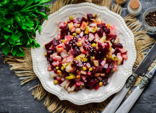 200 г вареной говядины, 200 г ветчины, 200 г соленых огурцов, 200 г вареного картофеля, 100 г вареной свеклы, 100 г вареной моркови, 200 г майонеза, по вкусу – соль, перец горошком, лавровый лист, зелень Говядину отварить, добавив в бульон перец горошком и лавровый лист. Ветчину и охлажденную говядину нарезать кубиками. Свеклу, картофель и морковь нарезать ломтиками. Соленые огурцы нашинковать. Все компоненты соединить и заправить майонезом. Украсить рубленой зеленью. Винегрет по-французски