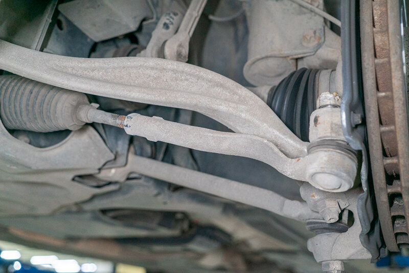 В процессе диагностических процедур были обнаружены износ шарнирного соединения наконечника левой рулевой тяги и выработка резинометаллических шарниров поперечного левого рычага. Кроме того, был выявлен износ правого ступичного подшипника. Поврежденные элементы требовали обязательной замены. После согласования с владельцем мы приступили к замене расходных элементов. Так как достаточно надежных аналогов на данный момент нет, было принято решение использовать оригинальные комплектующие Mercedes. Для начала потребовалось отсоединить рулевой наконечник от поворотного кулака. Процедура выполняется максимально аккурат