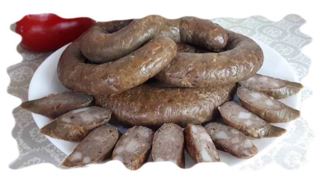 Рубец. Рубец 200, морковь 20, сельдерей 10, лук репчатый 20, сало топленое 10, соус томатный 125, чеснок 5, лист лавровый, перец, соль. Рубец хорошо вымывают, выворачивают наизнанку и погружают на 3–5 минут в кипяток, затем соскабливают слизь и пленки, оставляют только мышцы, заливают холодной водой и вымачивают несколько часов. Подготовленный рубец кладут в холодную воду и варят 3–4 часа, коренья и пряности добавляют к середине варки, а к концу – солят. Сваренный рубец нарезают полосками, как лапшу, поджаривают на топленом сале, заливают горячим томатным соусом, добавляют нарубленный чеснок и тушат. Подают с отварным картофелем или перловой кашей. Колбаса печеночная. Печень свиная 250, сало свежее 100, яйцо 1/5 шт., хлеб белый 25, молоко 50, лук репчатый 35, мускатный орех, перец, соль. Печень на несколько часов замачивают в холодной воде или в сыворотке. Вынимают, разрезают на куски, заливают холодной водой и варят 15–20 минут. Отваренную печень разрезают на более мелкие куски, подж
