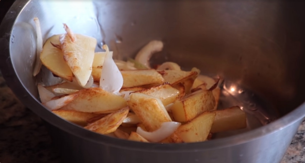 Считается, что Азу - это блюдо, которое должен обязательно попробовать любой, кто гостит в Татарстане. Приготовление блюда свободолюбивого, некогда кочевого, народа начинается с картошки, а данный рецепт с пары лайфхаков его жарки. Возьмите сковороду, добавьте растительное масло и включите не сильный огонь. Нарежьте 3 картофелины произвольными кусочками. Положите нарезанный картофель в миску с водой, чтобы промыть его от крахмала. Выложите промытый картофель на полотенце для обсушки. Когда масло в сковороде разогреется, резко повысьте температуру огня. Когда появиться небольшой дымок от масла, вывалите в сковороду картофель. Не перемешивайте картофель. Перемешайте овощ только тогда, когда картофель "прихватился" с одной стороны. После первого перемешивания добавьте нарезанную луковицу. Уберите нагрев до средней интенсивности. Когда картофель прихватиться со всех сторон и будет слегка недожаренным, снимите с огня и выложите в миску (на данном этапе полностью проготовленный картофель не нужен, так как в последствии он будет тушиться). Сковороду далеко не убирайте.