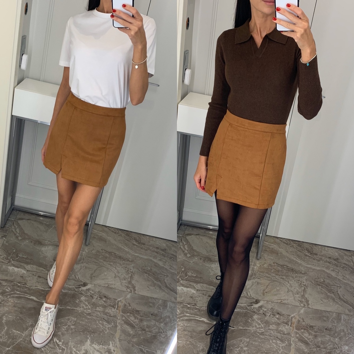 Очень классная мини-юбка по шикарной цене! Огромное количество цветов на выбор, есть даже розовая, или с леопардовым принтом. Я ношу такие юбки в любое время года, даже зимой с плотными колготками и длинным пуховиком. На ОТ-65 см и ОБ-90 см размер S сел хорошо, еще даже есть запас в талии около 4-5 см. Длина юбки на мой рост 175 см короткая, но носить можно :) Юбка трапециевидная. Застегивается сзади на скрытую молнию. Спереди на подоле есть небольшой разрез. Карманов нет. Ткань типа замши. Она ворсистая с лицевой стороны и гладкая с изнанки. Подкладки нет, но она и не нужна, так как материал не просвечивается. Ткань средней плотности, не тонкая. Немного тянется. Пошив фабричный, недочетов не было. Была бирка магазина.