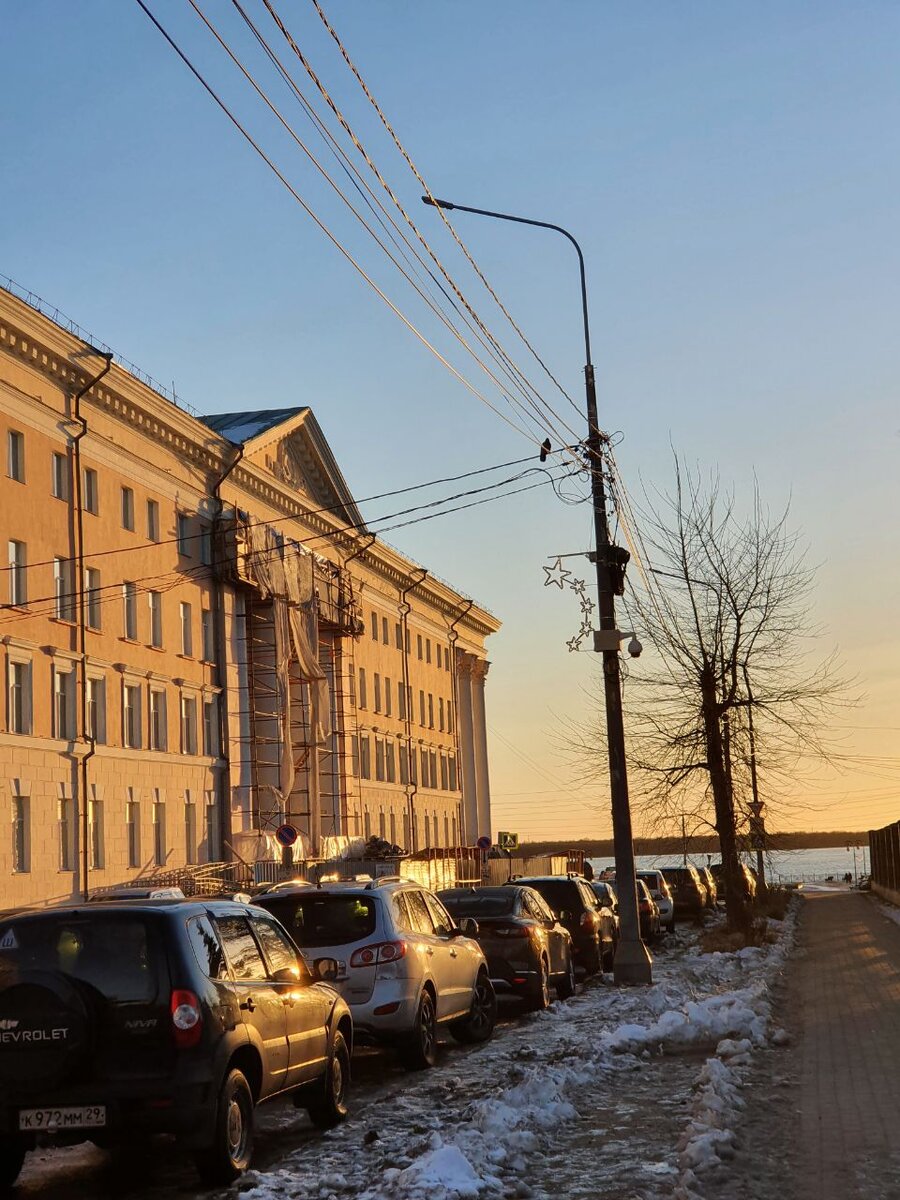 Прилетела сегодня утром. Успела запрыгнуть в автобус № 12, который довез до самого центра. В дороге разговорилась с милой местной жительницей (но не успела спросить, как её зовут). Поболтали про погоду, про архитектуру, про то, что улицы параллельные набережной тут названы проспектами (Троицкий проспект, проспект Ломоносова). В итоге получилась очень информативная поездка. На выходе из автобуса я уже знала, как выглядит здание областного суда, где в Архангельске главная площадь, что здание гостиницы, в которую мне заселяться, было построено в 80-х. Благодаря этому разговору я уже через полчаса пребывания в новом городе чувствовала себя очень уверенно. Будто я всё тут давно уже знаю. Погода для знакомства с городом была идеальная. Солнце, немного снега и - 5:) Эх, как же я скучала по снегу и такому легкому морозу. Итак. Что я сегодня успела увидеть? Солнечные улицы Набережную Северной Двины Деревянные скульптуры Закат Памятник Петру I (тот самый с 500-рублевой купюры) Ещё кусочек набе