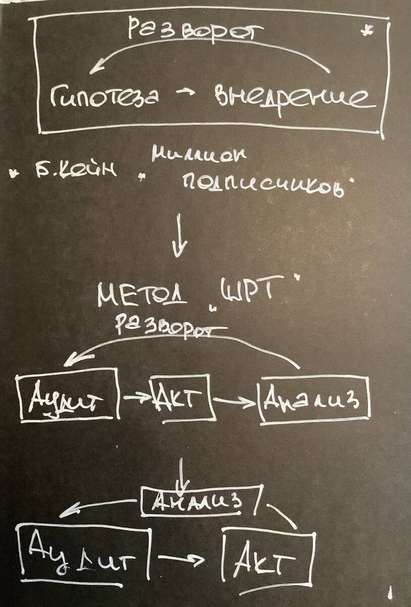 В книге "Миллион подписчиков" Брендана Кейна описывается приём, который за короткое время (всего месяц) позволяет набрать огромную аудиторию в социальных сетях: гипотеза-внедрение-разворот. Механика её реализации следующая: 1. ГИПОТЕЗА. Вы делаете максимально возможное количество вариантов одной публикации (картинка с текстом). 2. ВНЕДРЕНИЕ. Постите её на своей странице и смотрите как реагирует на неё ваша аудитория. Мгновенно проводите анализ реакции и делаете... 3. РАЗВОРОТ. Повторяете варианты её публикации настолько часто, пока не понимаете какая именно картинка соберет наибольшее количество лайков/комментариев/репостов Потом тестируете следующий тип контента. Как это может относиться к вашим публичным выступлениям? Мы с вами живём в такое время, когда для одной презентации уже мало подготовить только ОДИН текст. Возможных вариантов работы с аудиторией должно быть максимально возможное количество. - вы планировали свое выступление утром, но его перенесли на время