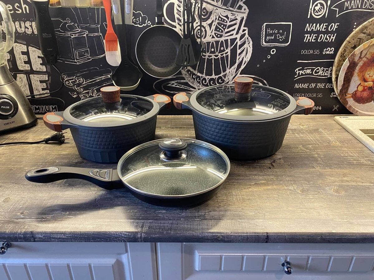 Не за горами Новогодние праздники - суета, подарки, игрушки, елка. Самое чудесное время года. Но я уже успела порадовать себя любимую и купить для себя подарок - шикарные кастрюли и сковородку от немецкого производителя Resto Kitchenware! ВАУ! Не так давно звонит мне сестра, говорит: "Смотрю сейчас шоу с Александром Бельковичем - это кулинар, который еще ведет шоу на СТС, посмотри в какой классной посуде он готовит - в 3D". Кастрюли 3D? Честно, я впервые о таком слышу. Нашла по ссылке этот выпуск. Действительно - посуда просто загляденье! Я с удовольствием делюсь ссылкой: Кстати, в этой кулинарной программе Александр Белькович готовил блюда из известных зарубежных фильмов. И даже научил готовить настоящий британский чай с молоком (там все не так очевидно, как я раньше думала!) В общем, про кастрюли. Я влюбилась в эту посуду! И захотела себе такую же. Я погуглила, цены на эту посуду "кусаются". Решила проверить на OZON, и там нашла эту же посуду Resto Kitchenware с 35%-ными скидками. В