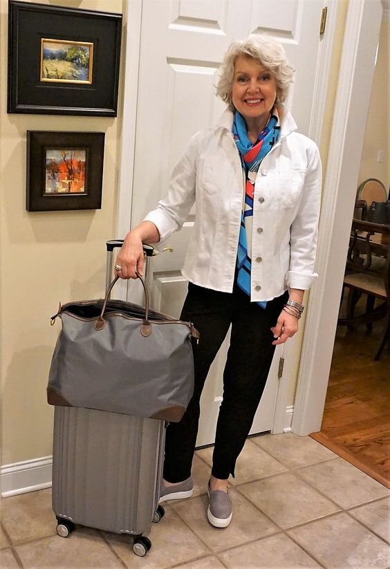 - Стильный образ для любительницы путешествий и не только. Комплект состоит из узких чёрных брюк длиной до щиколотки, белой куртки, сшитой в джинсовом стиле и яркого шейного платка, который обвернут вокруг шеи и заправлен под куртку. Образ дополняют удобные светло-серые слипоны на толстой подошве.