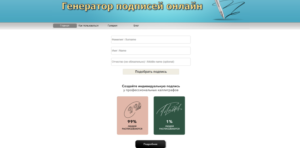 ссылка на сайт в конце статьи Ну что, мой дорогой друг, пришло время получать паспорт, а подпись до сих пор ставишь в виде крестика? или просто твоя фамилия? ну согласись же - бред и никакого креатива, подделать твою закорючку на раз-два. скорей тогда смотри, как исправить свое недоразумение: заходим на сайт и вписываем имя, фамилию жмякаем: подобрать подпись и выбираем о, пожалуй и сам сделаю новую пользуйся!=) podpis-online.ru