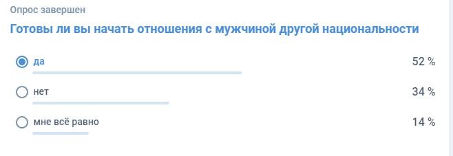 Страшную весть принёс я в твой дом, Надежда, зови детей! Наверное это идеальная цитата для начала статьи. Почему? А сейчас я расскажу. Если вы давно меня читаете, то видели темы, в которых я проводил опросы на сторонних сайтах. В этот раз тем опроса звучала так: " Готовы ли вы начать отношения с мужчиной другой национальности?" Я просил не просто проголосовать, но и как-то прокомментировать свой выбор. Вот так выглядят результаты на то момент, когда я закрыл опрос. Если мы сложим тех, кому всё равно и тех, кто проголосовал "за", то у нас получается 66% На мой взгляд это довольно большой процент - больше половины! С кем же именно они готовы начать отношения? Остальные комментарии приводить не буду - во многих очень не литературные слова. Радует одно - дамы готовы строить отношения лишь с европейцами. Многие сразу отметали представителей южных регионов и стран Средней Азии. Но почему такой большой процент готов отвернуться от своих мужчин? Хоть слова будут вырваны из контекста, но женщи