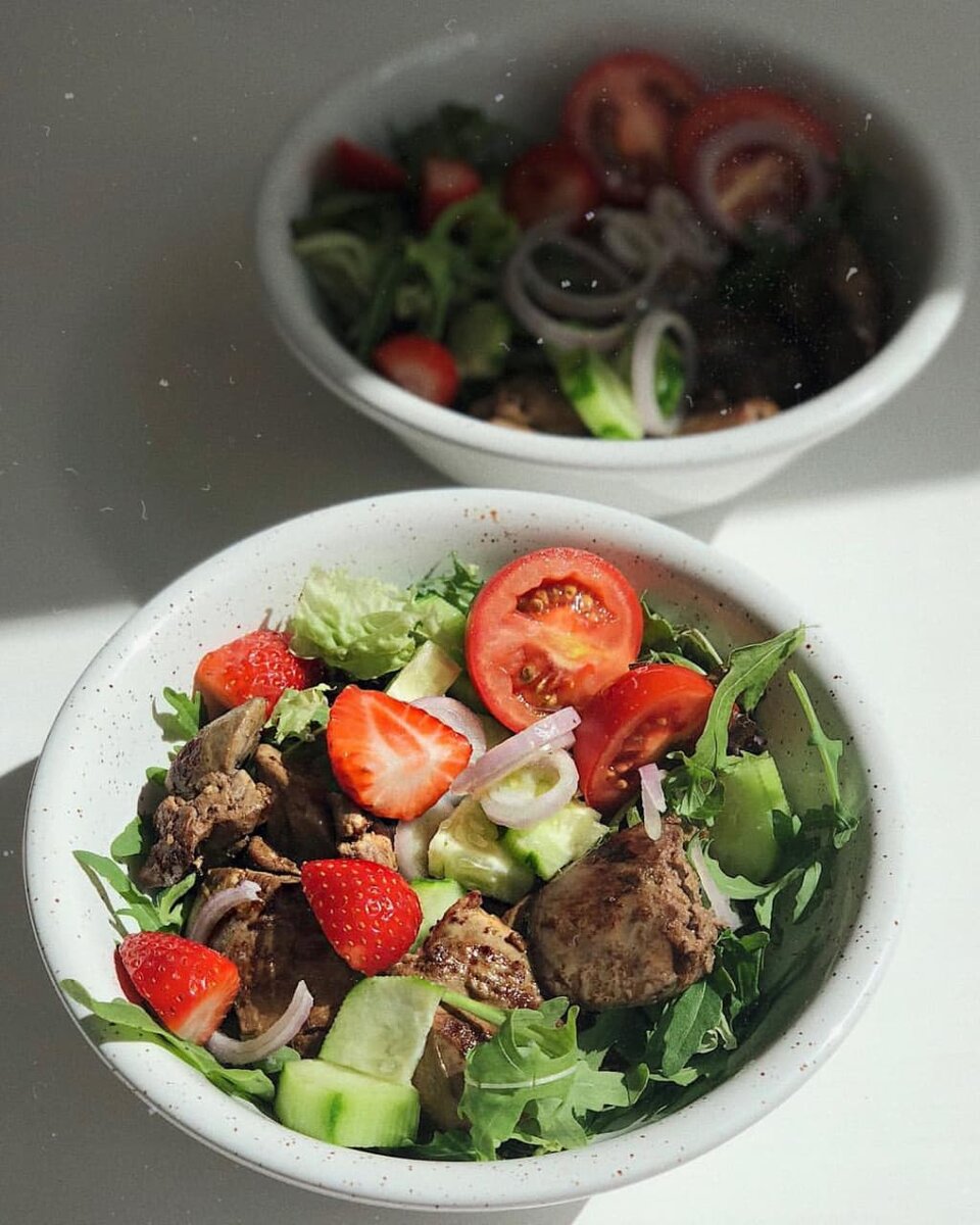 с куриной печенью -листовой салат -руккола -клубника -лук-шалот или красный -обжаренная куриная печень -томаты Черри -свежий огурец ⠀⠀ с куриной грудкой и беконом -обжаренная куриная грудка -подсушенный на сковороде бекон -листья салата айсберг -отварное яйцо -лук -кукуруза -авокадо ⠀⠀ с телятиной и печёным картофелем по-деревенски -обжаренная телятина -печёный картофель -листья салата -руккола -томаты -соус «домашний майонез» -яйцо с жидким центром или пашот