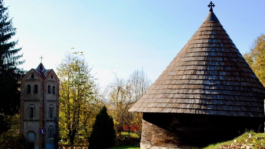 В центре села стоит школа в старинном стиле, рядом каменная церковь Святого Георгия, а за ней ещё одна — деревянная. Таких я в Сербии раньше никогда не видела.