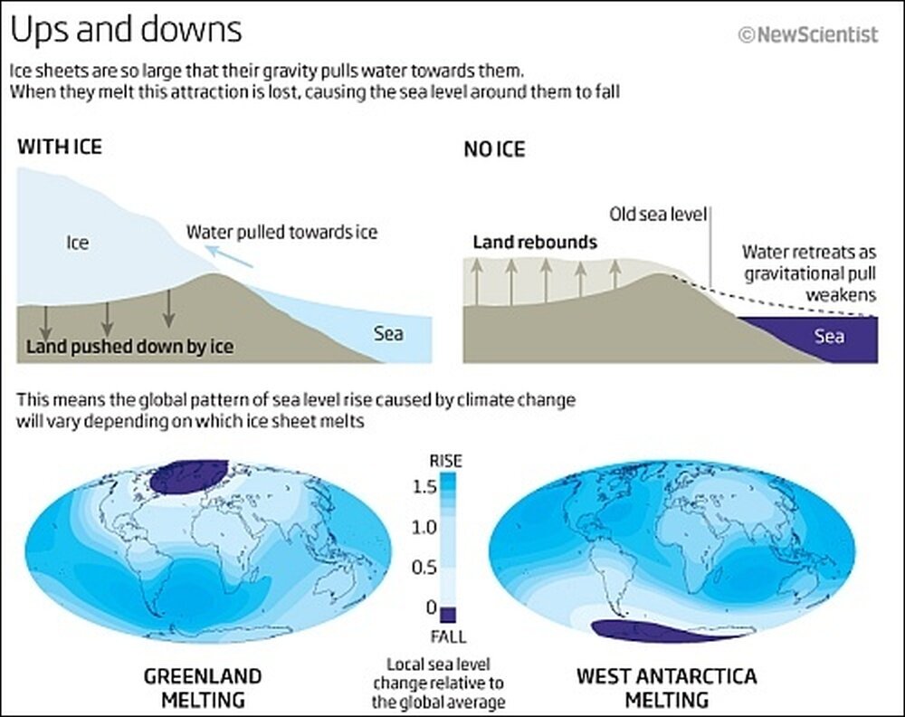 Ледовые щиты давят на земную кору, выгибая ее. При таянии кора будет выпрямляться и области вокруг Гренландии и Антарктиды будут подниматься. И север России, и Европа как раз поднимутся. Так, с последнего похолодания продолжает подниматься Гудзонов залив на 2 мм в год. Ведь ледяной покров был настолько тяжелым во время последнего похолодания, что кора северной Америки и Евразии опустилась на 500 метров и до сих пор продолжает подниматься.