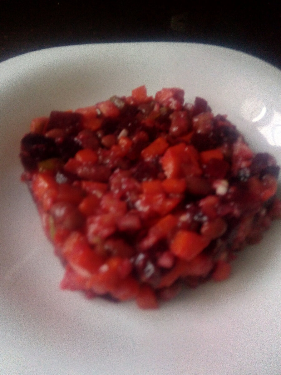 Здравствуй, по классике сам салат и так без животного жира, в этом рецепте главные овощи были запеченные. Ингредиенты: лук - 100гр. соленый огурец - 100гр. фасоль консервированная- 180гр. морковь - 200гр. свёкла - 250гр. картофель - 150гр. растительное масло - 50мгр. чеснок - 10гр. соль - 2гр. сахар - 5гр. Время приготовления: 70 минут. Первым делом ставим в духовку морковь, свеклу и картофель на час 200-220 градусов. Шинкуем мелким кубиком лук, средним кубиком соленый огурец (до 1см), консервированную фасоль (без жидкости), соединяем в миске присыпаем солью и сахаром. Картофель стоит вынуть раньше примерно на 40-й минуте запекания. По готовности моркови и свеклы очищаем. Нарезаем так же как и огурцы кубик до 1см. Все соединяем заправляем маслом, соль и сахар по вкусу. Приятного! рецепт: Ресторанный борщ - веганский или на говяжьем бульоне с салом #диета для похудения #нежир #изресторана