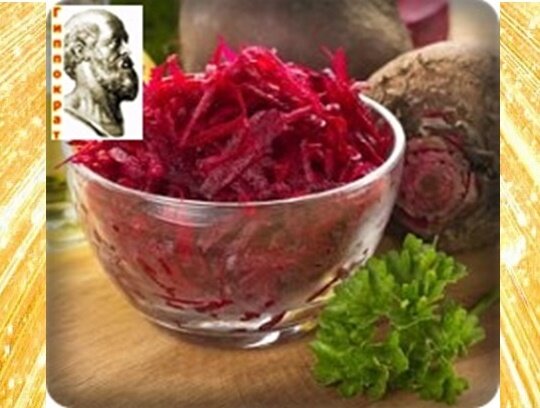 Самые древние археологические доказательства использования свеклы были найдены на неолитическом месте Аартсвуд в Нидерландах и в Саккаре (Египет). Этим находкам более 5000 лет Древние греки выращивали свёклу около 300 г. до н.э. Но они никак не использовали корни растения и ели только листья. Тем не менее, они «уважали» корень и преподносили его богу солнца Аполлону в храме Дельфи. Для них корень свёклы был на вес серебра. Древнегреческий врач и философ Гиппократ является основоположником современной медицины. Родился около 460 года до н. э. на острове Кос. Умер около 370 года до н. э. в Фессалии. Гиппократ использовал листья свёклы для связывания и перевязки ран, а корень свеклы называл «Даром Богов» ниспосланный человеку для продления его жизни. № п.п. Название продукта Количество продукта 1 свекла 2 — 3 корнеплода 2