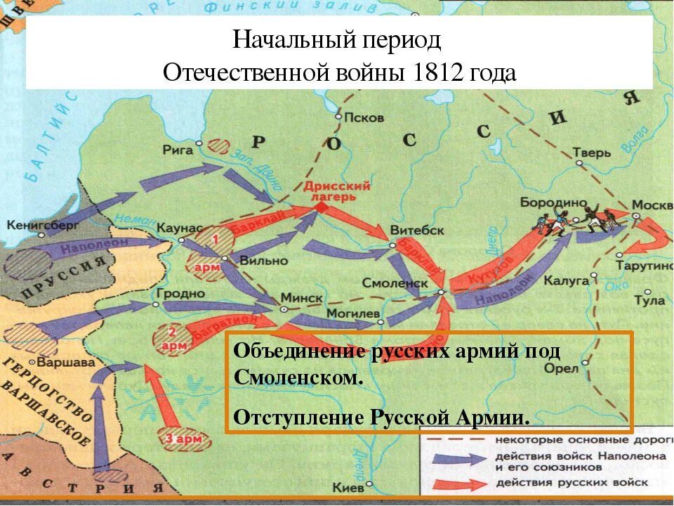 22 (3 августа) июля армии Багратиона и Барклая де Толли соединились под Смоленском. Командование объединенной армией принял на себя Барклай де Толли, в распоряжении которого оказалось 130 тысяч солдат, в то время, как передовой отрад французской армии насчитывал 150 тысяч солдат.