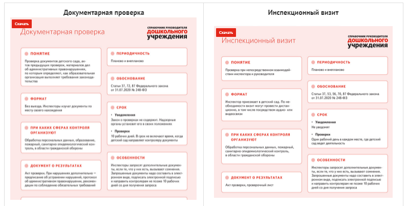 Есть семь видов проверок, при которых инспекторы контактируют с работниками детского сада. Представители надзорных органов могут прийти с документарной проверкой, нанести инспекционный визит, провести выездную проверку, рейдовый осмотр, выборочный контроль, контрольную и мониторинговую закупки (ч. 2 ст. 56 Федерального закона от 31.07.2021 № 248-ФЗ). Чтобы подготовиться к каждой проверке, понимать, как они будут проходить, и что ждать от инспекторов, воспользуйтесь памятками >> Скачать памятки