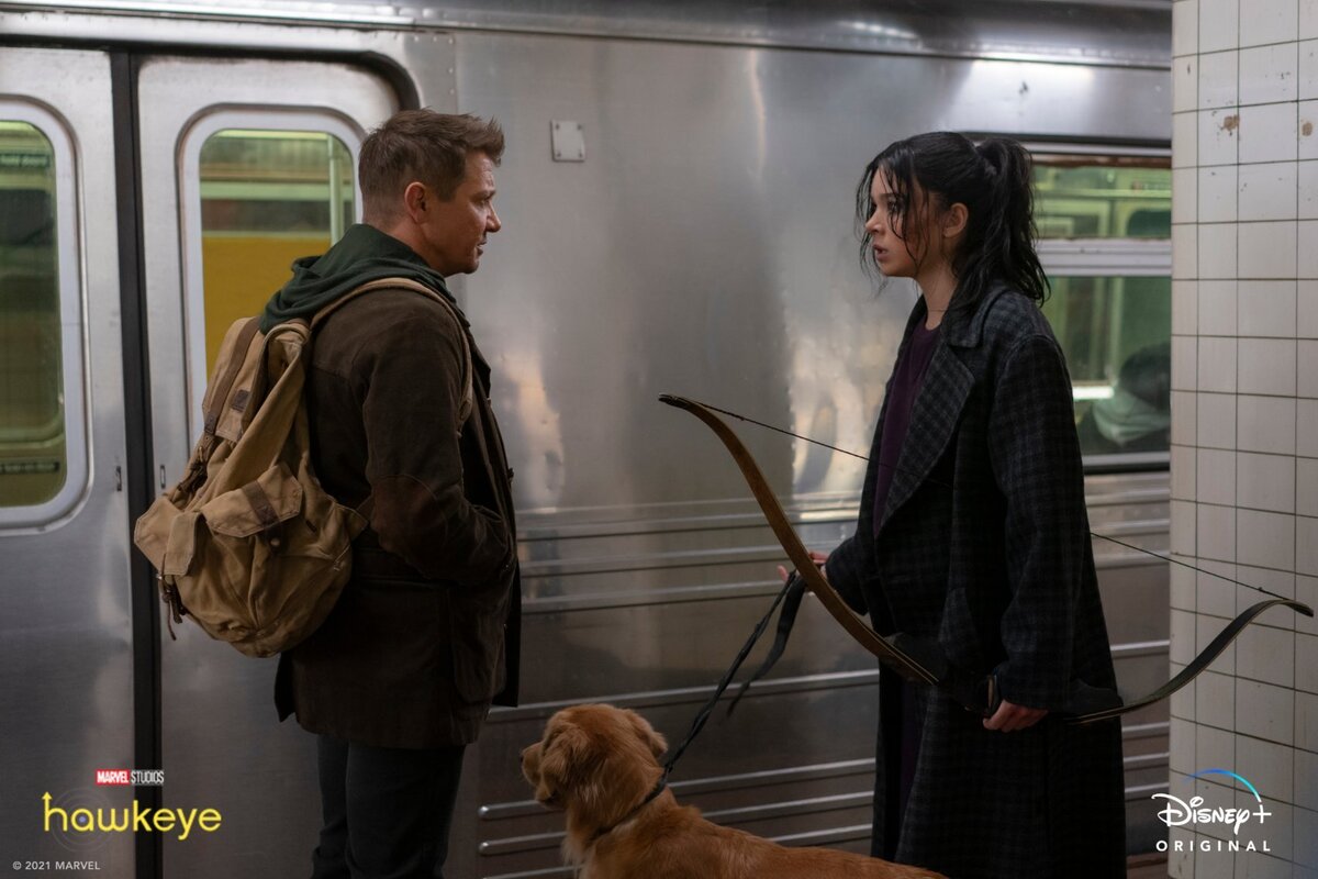 На днях "Marvel Studios" опубликовала кадр сериала "Соколиный глаз", показывающий встречу Клинта Бартона и Кейт Бишоп. Бишоп заметно растеряна на кадре. Девушка вооружёна луком и ведёт свое пса Баки. А Клинт стоит с походным рюкзаком, как-будто собрался в дорогу.
