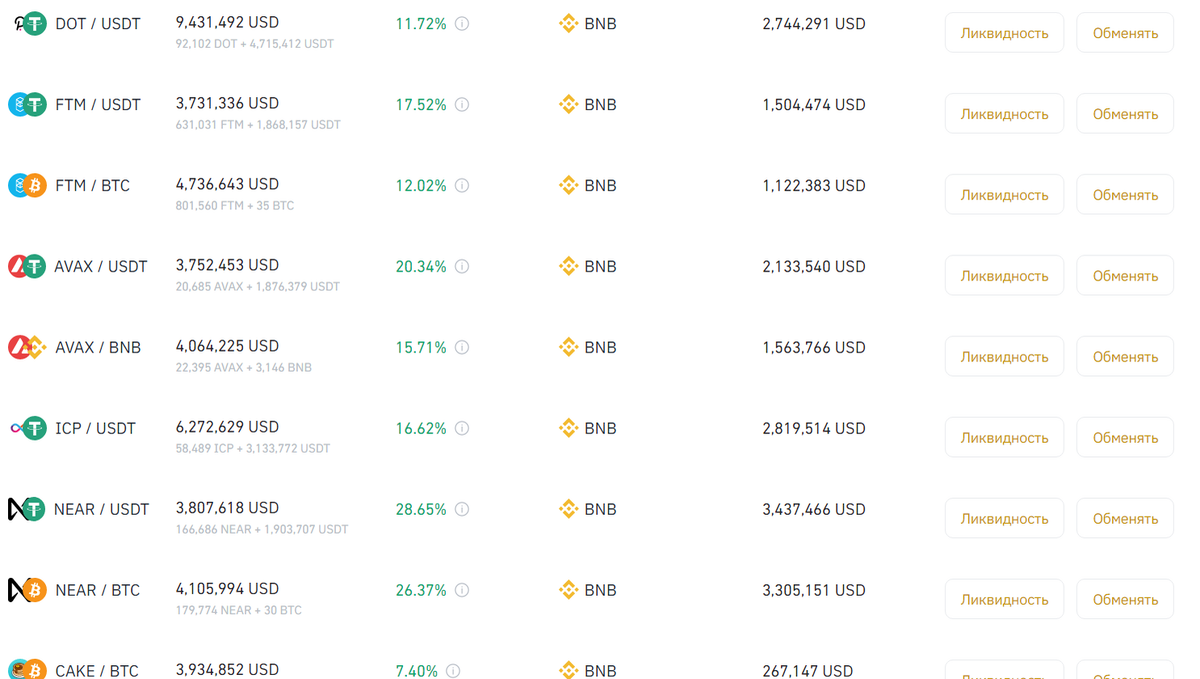 Итак, переходим во вкладку Liquid Swap в разделе финансы, видим список с криптовалютными парами и годовыми процентами.