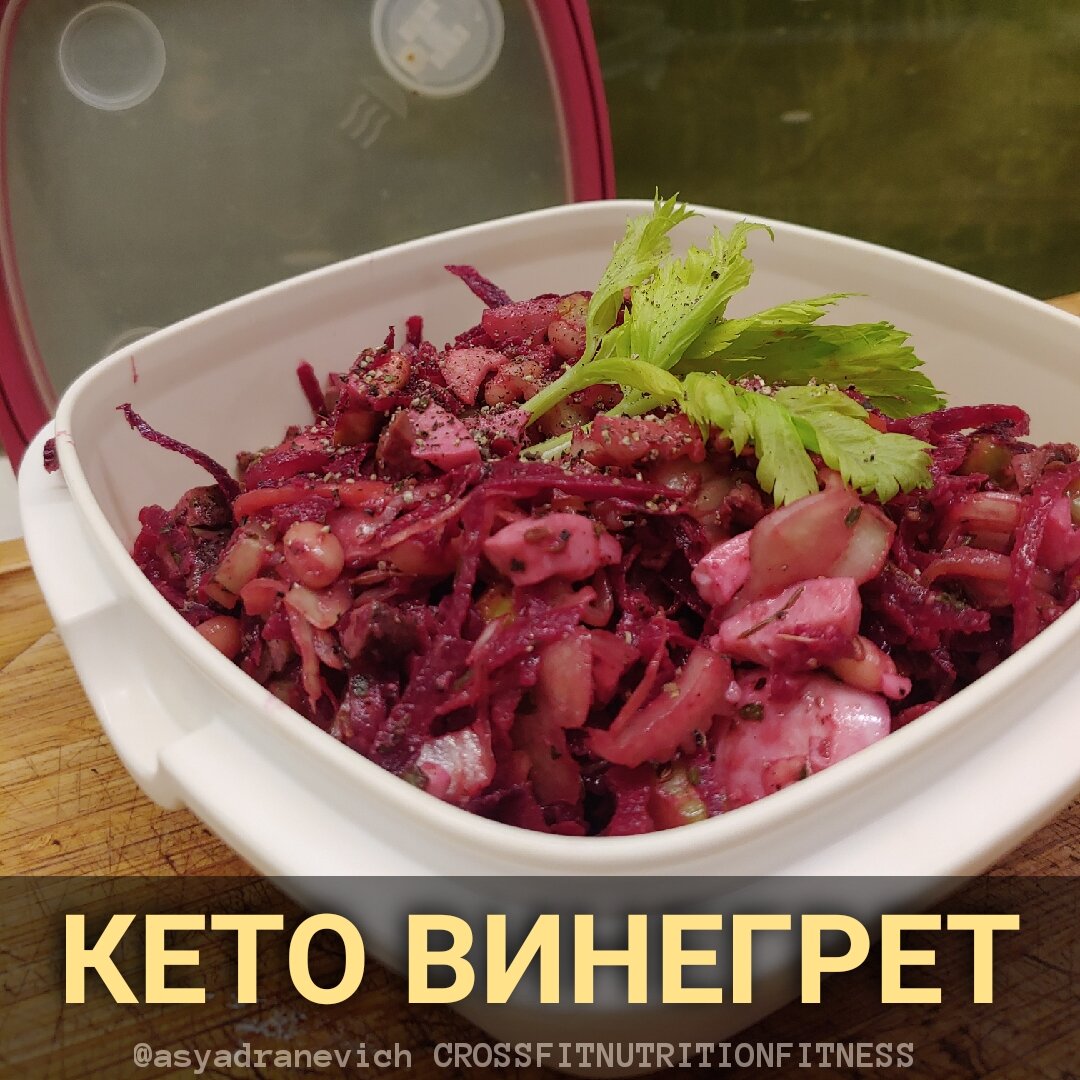 Красочный и питательный салат с изумительной кислинкой квашеной капусты и слегка сладковатой свеклой может превосходно скрасить хмурый ноябрьский день - однако, традиционные картофельные салаты едва ли можно назвать оптимальным вариантом для здорового, диетического питания (особенно, если в лучших традициях домашней кухни приправить их майонезом). Поэтому сегодня я расскажу вам альтернативный рецепт с гораздо меньшим содержанием углеводов и минимумом полуфабрикатов в своем составе. Этот рецепт нельзя отнести к строгому кето, поскольку среди ингридиентов все же присутствует потенциально крахмалистая свекла - однако, ее доля столь мала, что не слишком сказывается на кБЖУ блюда в целом. Плюс ко всему, мы будем использовать сырой овощ, что также существенно снизит ГИ. Ингредиенты: 75 г куриной печени 1 яйцо 30 г свеклы 30 г квашеной капусты 30 г авокадо 20 г сельдерея 20 г консервированной фасоли Черный перец Тмин Петрушка КБЖУ На порцию/указанное количество: 292/24/16/10 Приготовление: 1.