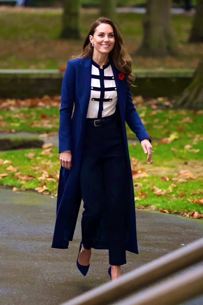 Герцогиня Кембриджская на этот раз отдала предпочтение всем оттенкам синего - синее пальто от Catherine Walker, синие немного укороченные брюки, синие туфли-лодочки. И белая блуза с синими деталями от любимого бренда Кэтрин - Alexander McQueen. В целом образ вместе с красивой прической Кейт получился шикарным!