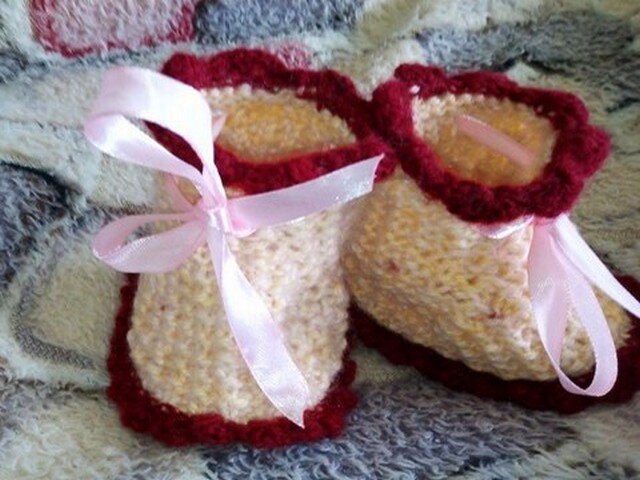 На днях знакомая родила долгожданную девочку. И нам захотелось сделать ей подарок. Кроме покупного костюмчика презентовали мы новорожденной и теплые пинеточки, связанные мной (все-таки на носу зима). У меня как раз нашелся клубочек черкесской пряжи персикового цвета (в тон костюмчику). Для отделки взяла немного вишневой ангорки, а для завязочек – узкую ленточку розового цвета. Башмачки на малышку вязать одно удовольствие – процесс идет быстро и через пару часов уже виден результат. Сам алгоритм не сложен и его способна освоить даже молодая мамочка, впервые взявшая спицы в руки. Описание работы · Берет комплект спиц для вязания носков, варежек № 2. · Набираем 32 петли. · Затем распределяем их равномерно на 4 спицы (по 8 петель на каждой). · Работу начинаем с подошвы, провязывая по кругу платочной вязкой 2 ряда, взяв за ориентир, что переход с одного ряда на другой осуществляется на середине задней части башмачка. · Далее переходим к прибавлениям, вывязывая протяжки в следующих местах: -