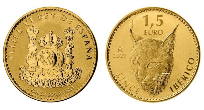Национальная фабрика монет и марок Испании (Real Casa de la Moneda) объявила о запуске первой в стране инвестиционной монеты. Новая золотая монета весом в одну унцию, на которой изображена иберийская рысь, далее будет выпускаться ежегодно. Casa de la Moneda подчеркнула долгую историю чеканки Испанией торговых монет. Серебряные реалы производились еще в 1497 году и в различных колониях Нового Света до обретения Мексикой независимости в 1821 году, а также дома, пока монета не была заменена монетой в пять песет в 1868 году. Золотые эскудо были впервые отчеканены в 1535 году, и за время их обращения до 1833 года они считались основной международной валютой. На реверсе монеты слева от головы рыси отчеканен знак монетного двора и год чеканки 2021. В верхней части монеты в две строки номинал 1,5 евро. Внизу по кругу надпись LINCE IBÉRICO. Мотивы и легенды окружены бусинами из кедровых орехов. На аверсе монеты изображены два полушария земли под королевской короной, окружённые колоннами Геркуле
