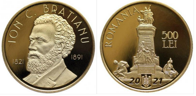Национальный банк Румынии 2 августа 2021 года выпускает золотую монету в честь 200-летия со дня рождения «Йона Константина Брэтиану». Йон Константин Брэтиану (2 июня 1821 — 16 мая 1891) - одна из главных политических фигур XIX века в Румынии. С 1838 года служил в Валашской армии, в 1841 году начал учится в Париже, где и завязал впервые сношения с республиканской партией. Вернувшись на свою родную землю, Брэтиану, вместе со своим другом Константином Розетти и другими молодыми людьми (в том числе и своим старшим братом Дмитру), принял участие в Валашской революции 1848 года; последняя была подавлена вступлением русских и турецких войск. Все лица, скомпрометированные революциею, были затем сосланы, и Брэтиану уехал в Париж. Только в 1857 году, после заключения Парижского мира 1856 года, он смог вернуться вместе с прочими изгнанниками в Валахию. В марте 1867 года Брэтиану стал со своими приверженцами во главе министерства и с перерывом сохранял власть до 1881 года. При осаде Плевны он посл