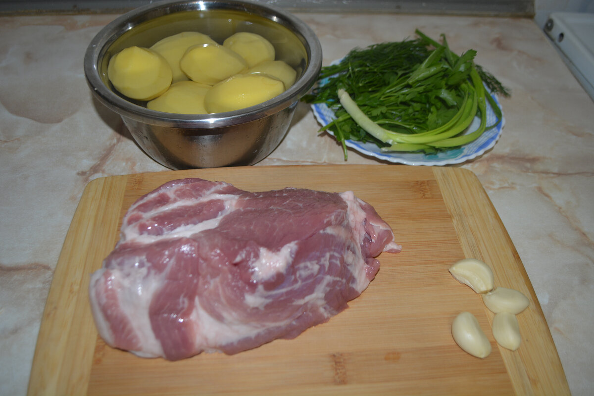 Друзья, привет ! Спорный рецепт))) хотя вроде бы всё просто))) Вобщем я готовлю так достаточно часто и вам рекомендую попробовать. Что по сути, мы готовим жаркое, хоть и называем это жареная картошка с мясом, тут меньше ингредиентов, но смысл не меняется. Вобщем берём : мясо и картофель, у меня свиная шея, она мягкая и быстро готовится, в идеале взять вырезку, но в шее больше вкуса ( на мой взгляд, ваши мысли пишите в комментариях), картофель у меня самый обычный, по возможности лучше взять так называемый "для жарки", но он в пару раз дороже и не всегда есть в магазине. Чеснок свежий и зелень, у меня укроп, петрушка и зелёный лук, достаточно вяленькая зелень, но что есть))) Плита на максималках, мясо небольшими кусочками " на один-два укуса", раскладываем ровным слоем и ждём 1-2 минуты, тут главное что б не сгорело Когда мясо становится мега красивым)) просто вынимаем его в тарелку Картофель режем как вам угодно, у меня достаточно крупные ломтики, так же как мясо укладываем в один сло