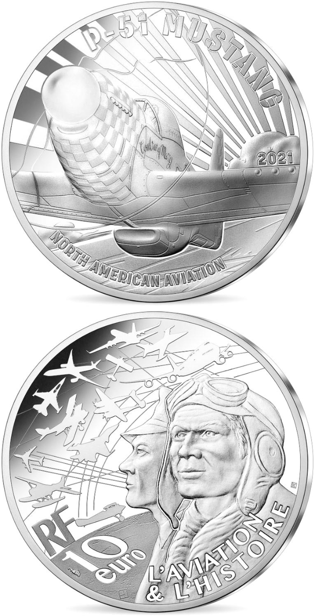 Франция выпустила памятную монету, посвященную американскому истребителю дальнего радиуса действия периода Второй мировой войны. В 2021 году Monnaie de Paris выпускает монета в честь P51 Mustang. Первоначально предназначенный для разведки и наземной поддержки, этот самолет имел крылья с улучшенной аэродинамикой. Именно во время Второй мировой войны он смог претендовать на звание лучшего истребителя благодаря новому двигателю. На аверсе изображен взлетающий "Мустанг" Р-51. На заднем плане видны солнечные лучи, скрытые облаком. Упоминание "NORTH AMERICAN AVIATION", относится к производителю этого самолета. Изображенный на фото Р-51-это самолет был приписан к 84-й истребительной эскадрилье, носящей название Contrary Mary (Супротив Мэри). Это был личный самолет подполковника Роя Кавинесса. На реверсе, общем для серии, изображены профили двух пилотов, символизирующие разные эпохи и типы использования: гражданские и военные. В небе находятся несколько самолетов, также представляющих разные э