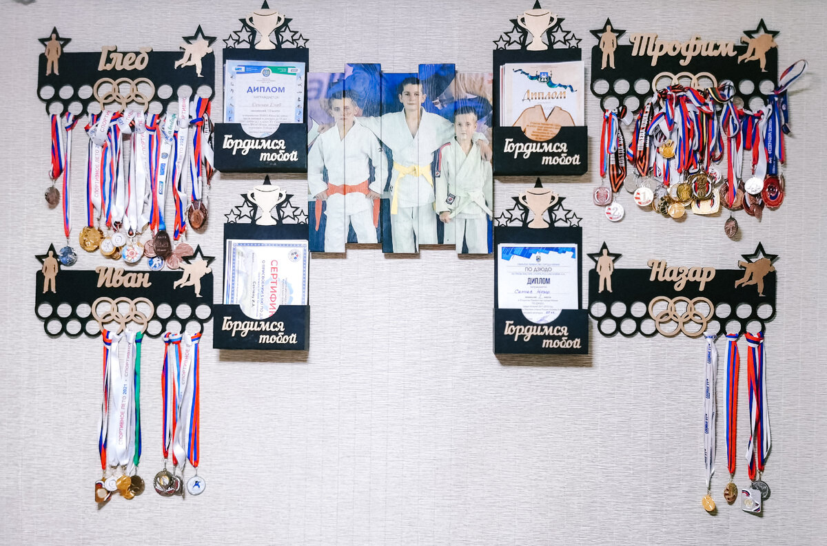 Я всё же это сделала... Несмотря на, очень плохое самочувствие вчера убила почти весь день и разобрала гору наград и дипломов своих сыновей. Медальницы мы получили давно, но всё откладывали на потом это занятие... Вчера все рассортировала и мальчишки развесили. Мои дети — спортсмены. Занимаются борьбой. Старшие ещё и пауэрлифтингом+тяжёлой атлетикой. Оба уже разрядники по двум видам спорта. У Трофима 1 юношеский по дзюдо и 1 юношеский по тяжёлой атлетике. Он выполняет и большие нормативы, но по возрасту это максимум того, что он может иметь. У Глеба третий юношеский по тяжёлой атлетике и 1 юношеский по дзюдо. Остальные мальчишки до разрядов пока не доросли. В спорт их отправил папа. Он и сам занимался дзюдо. Мальчишки пришли в этот вид совершенно ничего о нём не зная, но им попался такой тренер, который заставил их влюбиться в дзюдо и сделать его образом жизни. Там ведь имеется своя, собственная философия... Парни пришли поздно, уже в 3 классе(вместо первого), но через два м