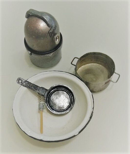 Очень часто в миниатюре приходится использовать вещи не по назначению. Всякие крышечки, колпачки, пружинки, упаковки от киндер-сюрпризов идут в дело. Покажу несколько предметов, которые получились из такого вторсырья На фото выше представлены: 1. Пылесос "Буран". Сделан из упаковки от киндера (верхняя часть), нижней части пластиковой баночки (низ), части кнопки (отверстие для шланга), обмотки проволоки (черный ободок) и картона. 2. Тазик. Сделан из дна баночки от Чудо-йогурта. В некоторых моделях йогуртов донышко образует идеальный таз. Остается только вырезать и края подкрасить. 3. Кастрюля алюминиевая. Сделана из завинчивающейся металлической крышки от чего-то, скорее всего от спиртного. Бороздки для завинчивания распрямила с помощью плоскогубцев, ручки сделаны из скрепки. Еще где-то была крышка, не смогла найти. 4. Сковорода. Крышка от баночки с краской для детских поделок и немного картона 5. Венчик. Сделан из какой-то спиральки, которая лежала "на всякий случай" и кусочка зубочис